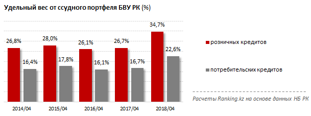 В исследовании отмечается, что объем розничного кредитования БВУ РК второй год подряд показывает стабильный рост, к концу апреля 2018 года объемы займов физлиц достигли 4,7 триллиона тенге, что на 14 процентов больше, чем годом ранее. Их доля от ссудного портфеля выросла с 26,7 процента до 34,7 процента.