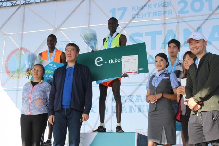 В этом году победителям в дистанции 42,2 километра (для мужчин и женщин) вручаются следующие призы: за первое место - 850 000 тенге плюс авиабилет в любом направлении; за второе место - 200 000; за третье - 100 000 тенге.