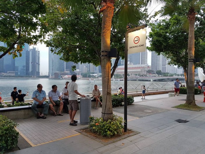 "В Сингапуре на набережной Марина Бей есть специальные места для курения. То есть нельзя ходить с сигаретой, где попало, выдувать дым в лицо прохожих, задевать зажженной сигаретой окружающих.