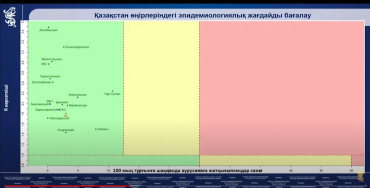Новую матрицу показали на брифинге министра здравоохранения Ажар Гиният в Службе центральных коммуникаций. Судя по обновленному графику, все регионы Казахстана находятся в "зеленой" зоне по эпидемиологической ситуации.