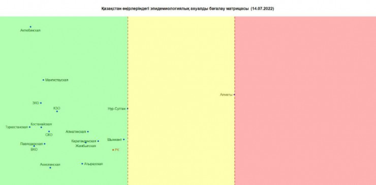 Отметим, что по старой матрице (на 14 июля 2022 года) Алматы находился близко к "красной" зоне, а Нур-Султан располагался на границе "зеленой" и "желтой" зон.