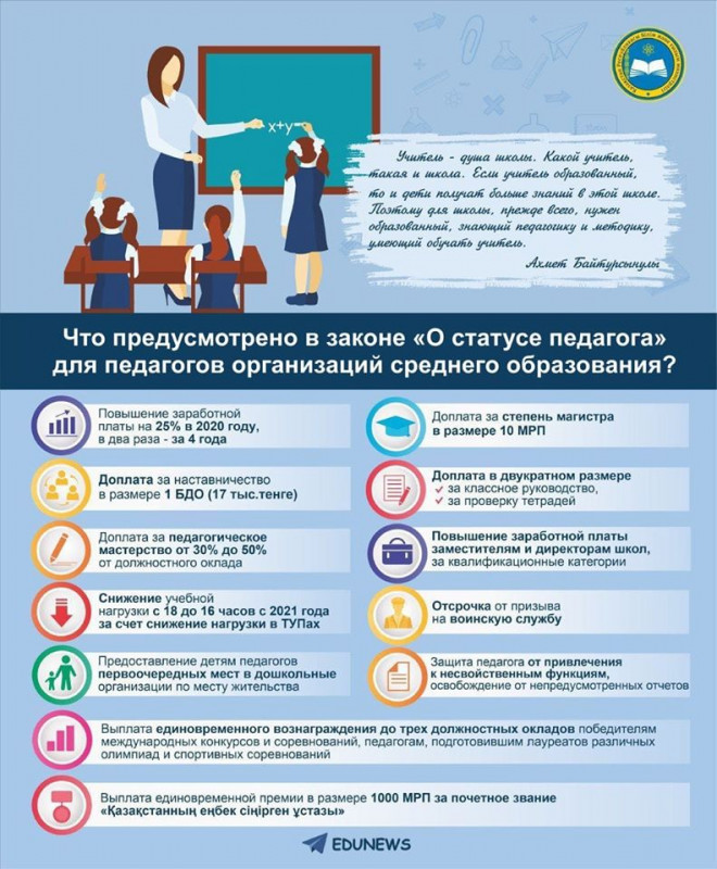 Кроме того, предусмотрены доплаты за степень магистра в размере 10 МРП, а также доплаты за классное руководство и проверку тетрадей. Также педагоги новым законом теперь защищены от привлечения к осуществлению несвойственных функций. Более подробно с нововведениями можно ознакомиться ниже.