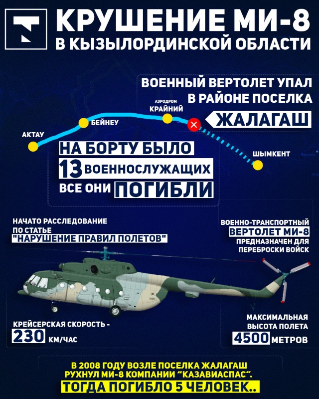 Вертолет Ми-8 потерпел крушение в Жалагашском районе Кызылординской области. Вертолет при неизвестных обстоятельствах упал и полностью сгорел. Погибли 13 военнослужащих.