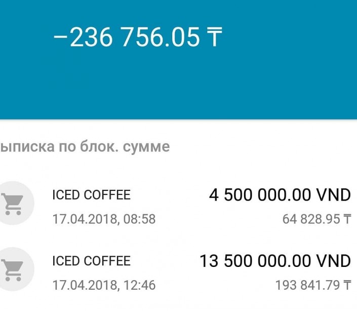 Через четыре дня в номере в отеле перед отъездом журналист обнаружила, что ее карточка заблокирована из-за огромного "минуса" на счете. "Я решила закрыть счет за мини-бар, так как возвращалась обратно в Казахстан. Но не смогла заплатить из-за заблокированной карты. Пошла в банкомат - нет доступа к деньгам. Решила посмотреть в хоумбанке, что происходит, и у меня чуть не случился инфаркт - я ушла в минус на 1,3 миллиона тенге! Эта сумма в блоке. Магазин показал чеки и выписку с терминала, все верно - 900 тысяч донгов. Но вдруг банк снимает с меня такую огромную сумму и закрывает мне доступ к карте", - поделилась алматинка.