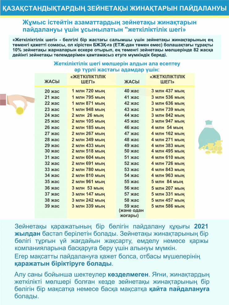 Әр жастың өз "жеткіліктілік шегі" болады. Бұл әзірше болжам бойынша жасалған сандар. Адамның жасы ұлғайған сайын оның БЖЗҚ шотындағы ақша да көбеюі керек.