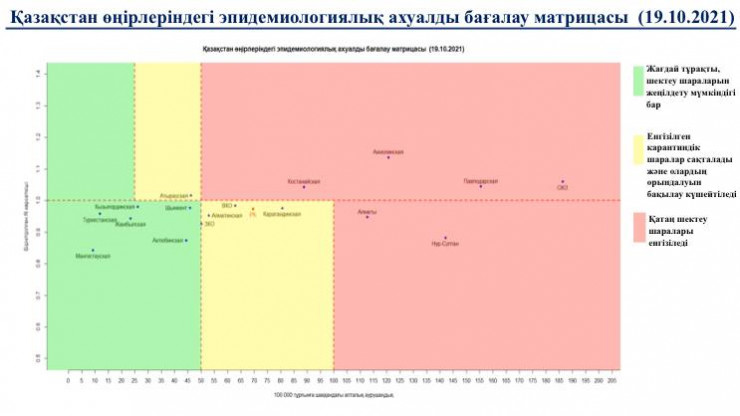 Матрица оценки эпидемиологической ситуации в регионах Казахстана вновь претерпела изменения, передает Tengrinews.kz со ссылкой на МВК по нераспространению COVID-19.