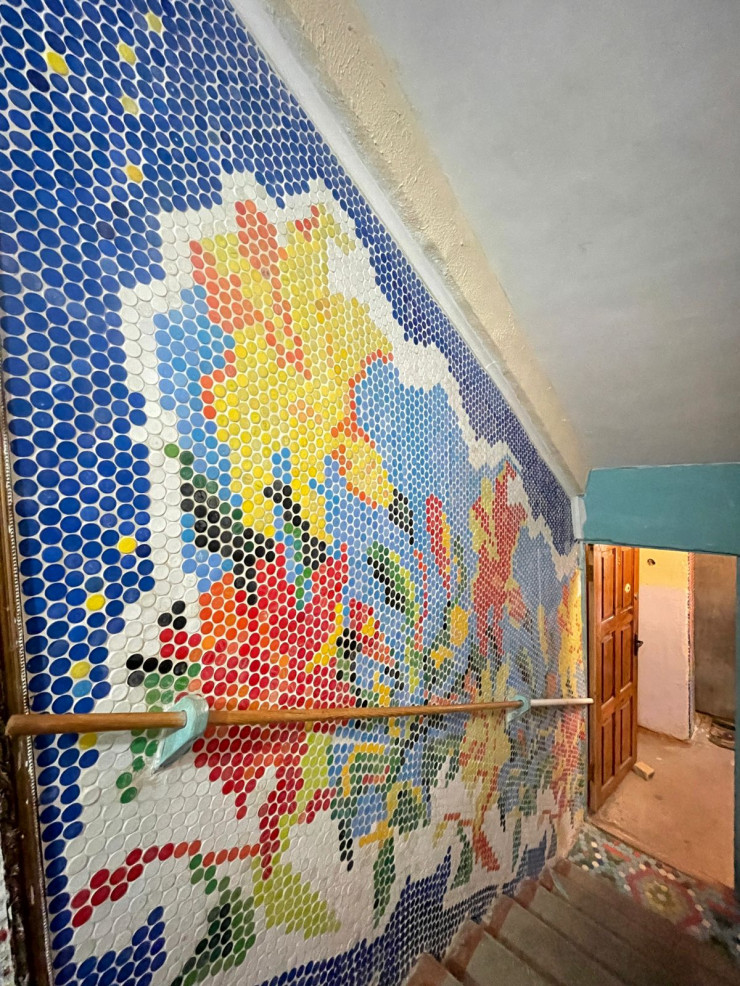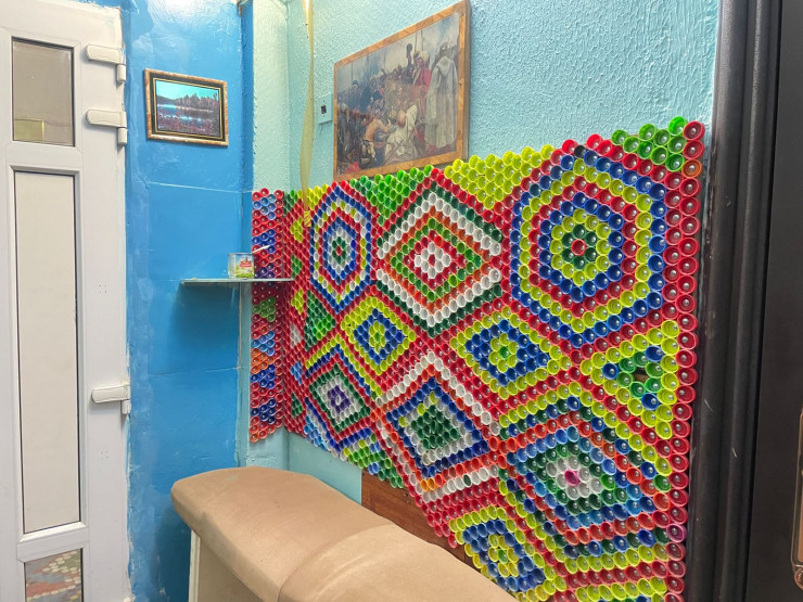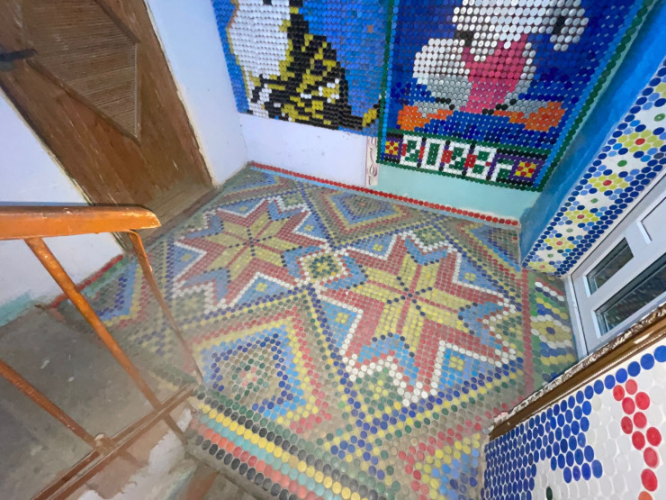 Житель Балхаша украсил подъезд своего дома мозаикой из пластиковых крышек. На оформление двух этажей у него ушло около 60 тысяч крышек.