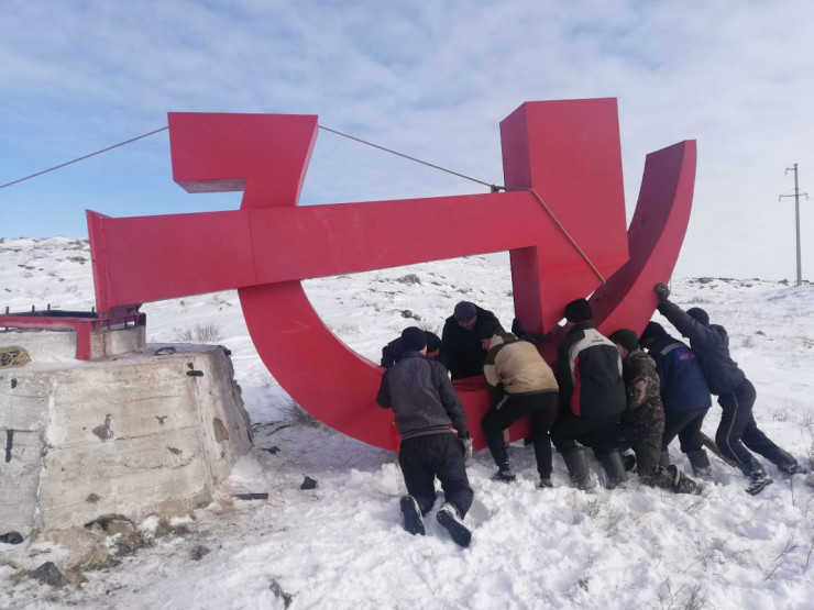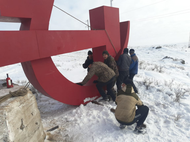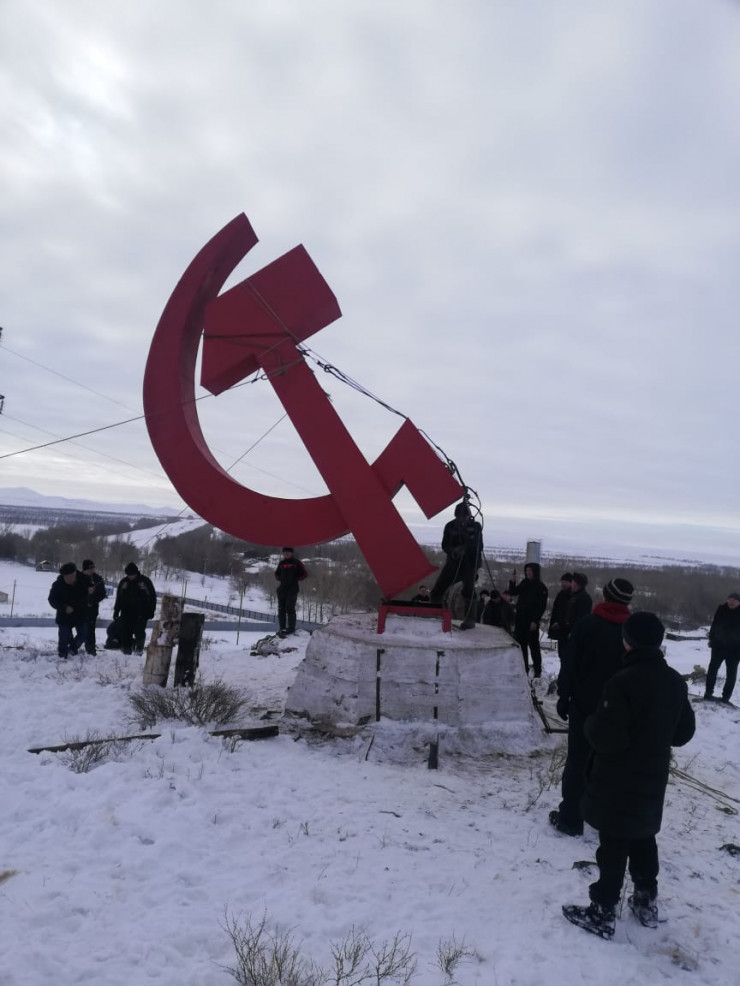 В Карагандинской области двухтонный монумент в виде серпа и молота таинственно исчез с постамента, а на его месте появился флаг Казахстана. Но жители близлежащего поселка за свой счет намерены вернуть памятник на место, передает корреспондент Tengrinews.kz.