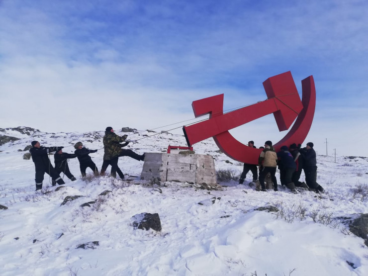 Громадные серп и молот были установлены 35 лет назад. Знак стоял на возвышенности и был виден издалека. Жители считали его символом поселка. Возле него выпускники местной школы встречали рассвет, у него фотографировались все приезжие, да и у местных жителей почти у каждого есть фото возле монумента.