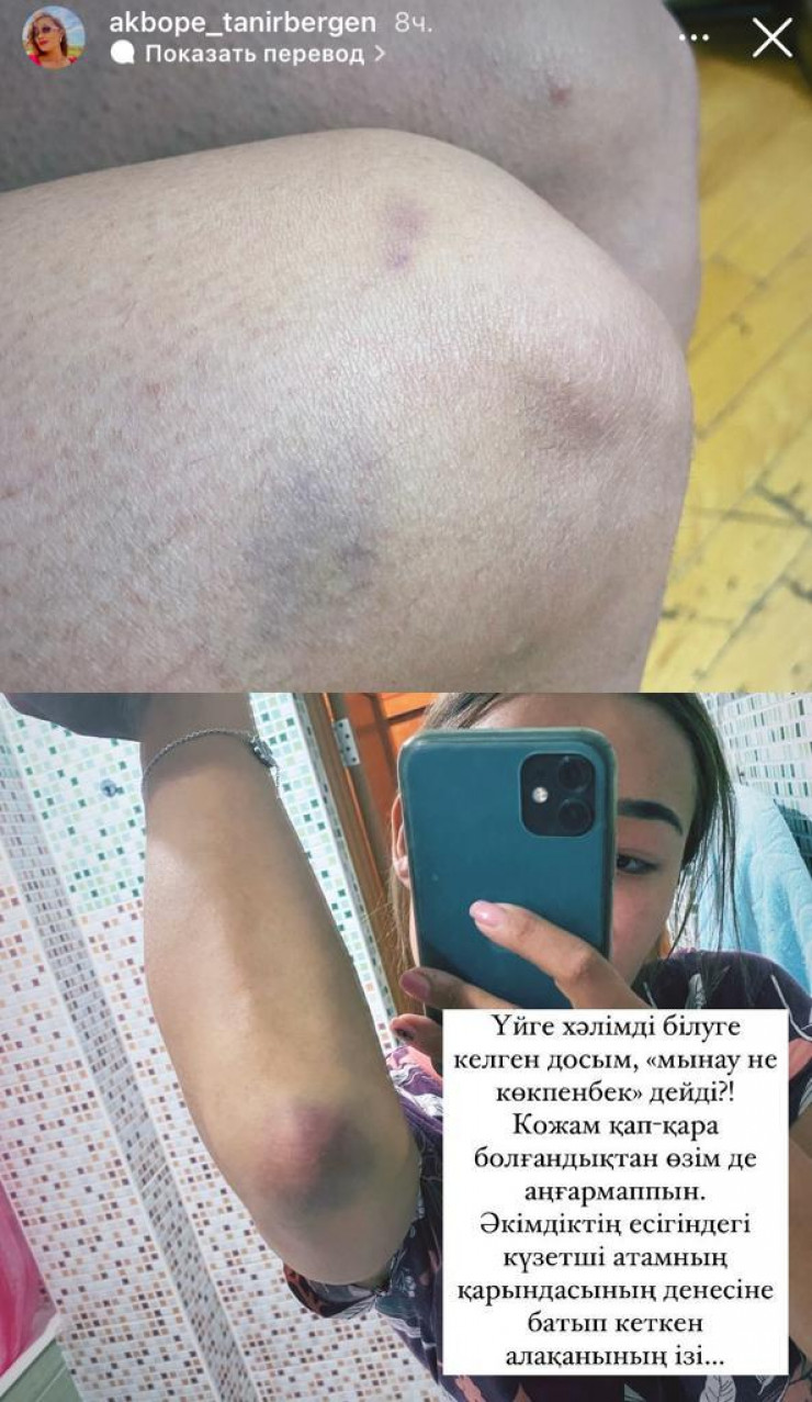 Сама Акбопе Танирберген в своем Instagram опубликовала фото синяков на своем теле.