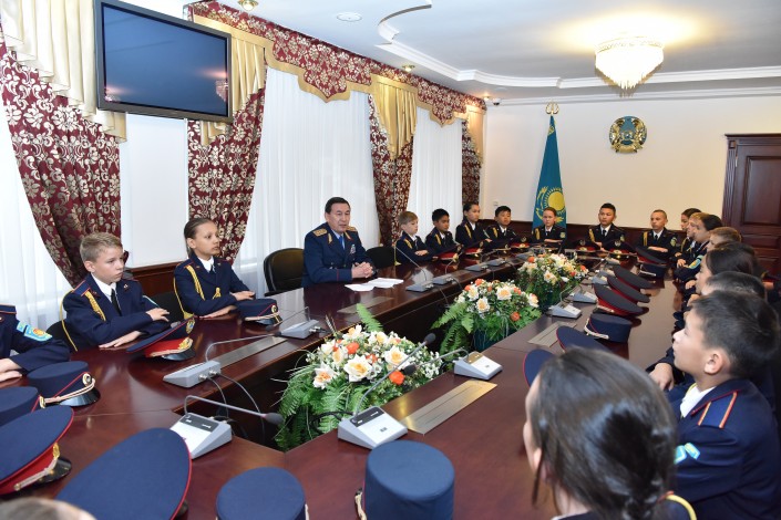 В беседе с кадетами министр внутренних дел отметил, что Глава государства Нурсултан Абишевич Назарбаев в своей статье "Болашаққа бағдар - рухани жаңғыру" говорил, что патриотизм начинается с любви к своей земле, к своему аулу, городу, региону, с любви к малой родине. Поэтому создание кадетских классов "Жас полиция" в первую очередь направлено на воспитание патриотизма и любви к Родине, профилактику правонарушений в школьной среде и оказание помощи при выборе профессии.