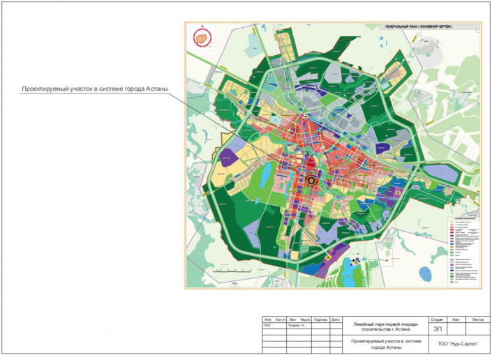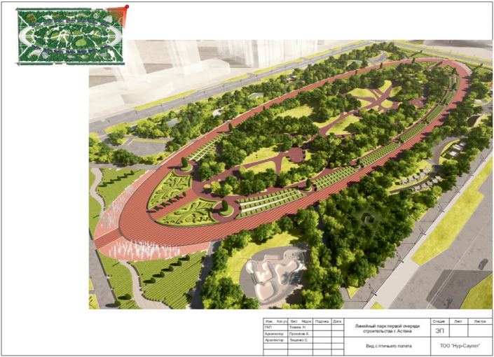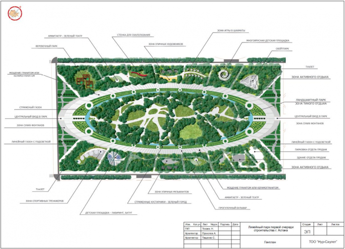 Сообщается, что доступным для прогулок и отдыха парк станет уже этой осенью. По генеральному плану он расположен между "Абу-Даби Плаза" и Ботаническим парком в границах улиц Акмешит и Туркестан.