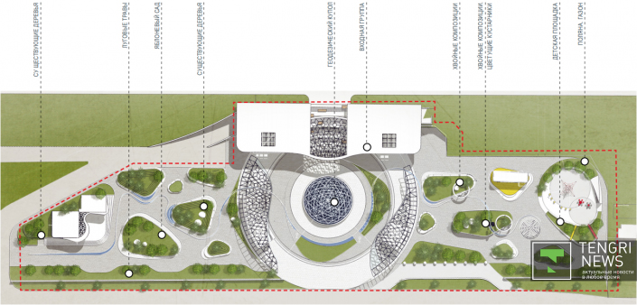 Судя по эскизному проекту, концепция редизайна ТРЦ "Алмалы" предусматривает сохранение одной "юрты", а не трех, как было ранее. Вокруг предполагается организация "полян", с высадкой цветущих кустарников, низкорослых деревьев, хвойных растений, луговых трав и характерных для Алматы цветов.