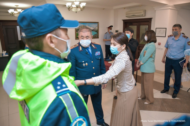 "Майка удобная, рубашка. Здесь нет железных звездочек, как раньше, не мешают и не цепляются за одежду. Шевроны другие. Здесь раньше был металлический. Также ввели принадлежность к территории и подразделению. И жилет (ярко-желтого цвета с надписью Polisia) короткий, удобный - летний вариант", - добавил Ерлан Тургумбаев.