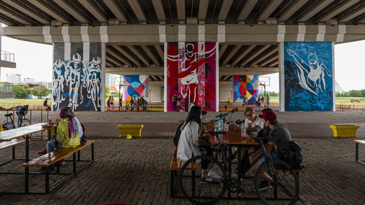 Проведено оформление колонн моста граффити-рисунками. На одной из стен изображен портрет легендарного баскетболиста Коби Брайанта. Жители могут здесь не только заниматься спортом, но и устраивать фотосессии.