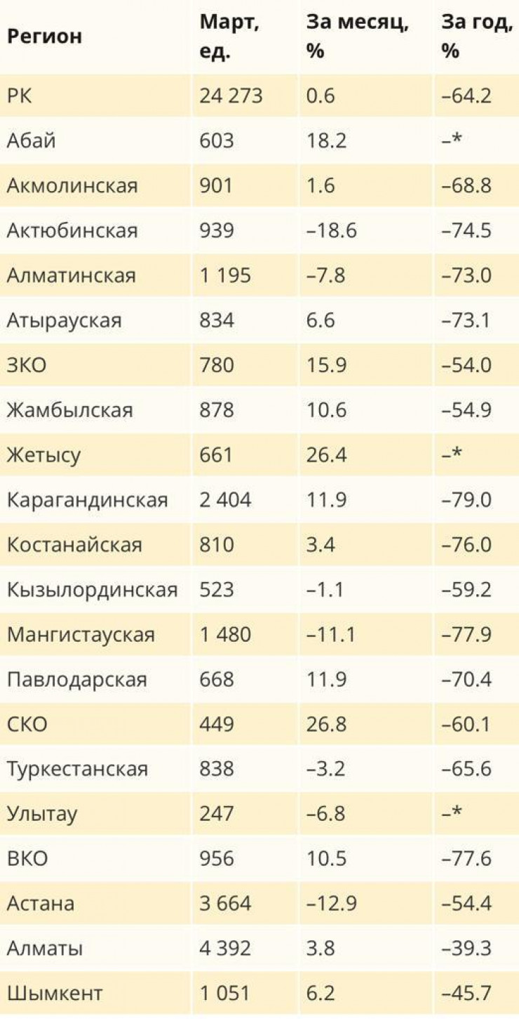 Меньше всего сделок оформили в марте в области Улытау (247), СКО (449) и в Кызылординской области (523).