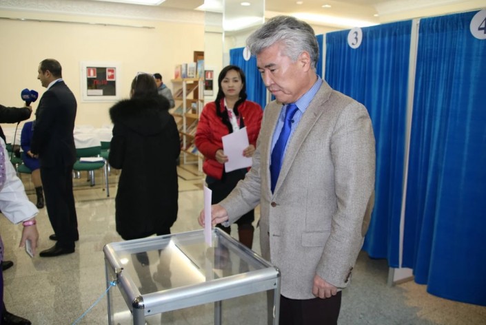 Экс-глава КНБ, сенатор Нуртай Абыкаев проголосовал на избирательном участке №81.