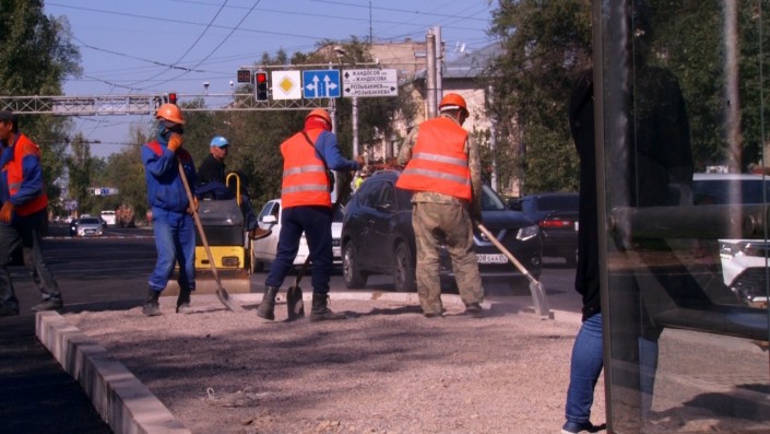 Также идет строительство остановочных павильонов посередине дороги между улицами Розыбакиева и Гагарина. На участках, где остановки поставлены посередине дороги, частные авто объезжают остановку с правой стороны. Между улицами Розыбакиева и Гагарина транспорт все еще едет по центру дороги, так как правая сторона еще не готова.