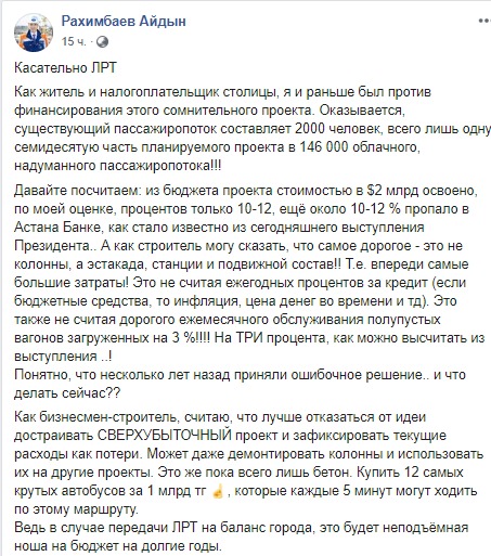 "Давайте подсчитаем: из бюджета проекта стоимостью в 2 миллиарда долларов освоено, по моей оценке, процентов только 10-12, еще около 10-12 процентов пропало в Астана Банке, как стало известно из сегодняшнего выступления Президента... А как строитель могу сказать, что самое дорогое - это не колонны, а эстакада, станции и подвижной состав! То есть впереди самые большие затраты! Это не считая ежегодных процентов за кредит. Это также не считая дорогого ежемесячного обслуживания полупустых вагонов, загруженных на 3 процента", - написал он.
