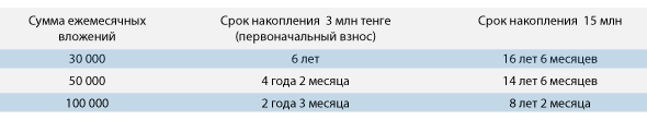 Если свободная сумма составляет уже 50 000, то взнос будет собран примерно за 4 года. При отчислениях в 100 000 тенге срок сократится до 2,2 года. Без ипотеки обойтись можно, но необходимые для приобретения квартиры 15 миллионов соберутся в лучшем случае за восемь лет.