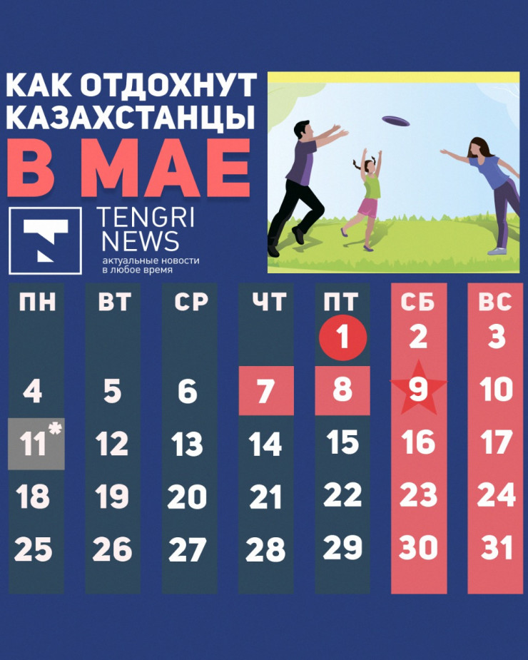 В мае у казахстанцев будет 13 выходных дней, передает Tengrinews.kz.