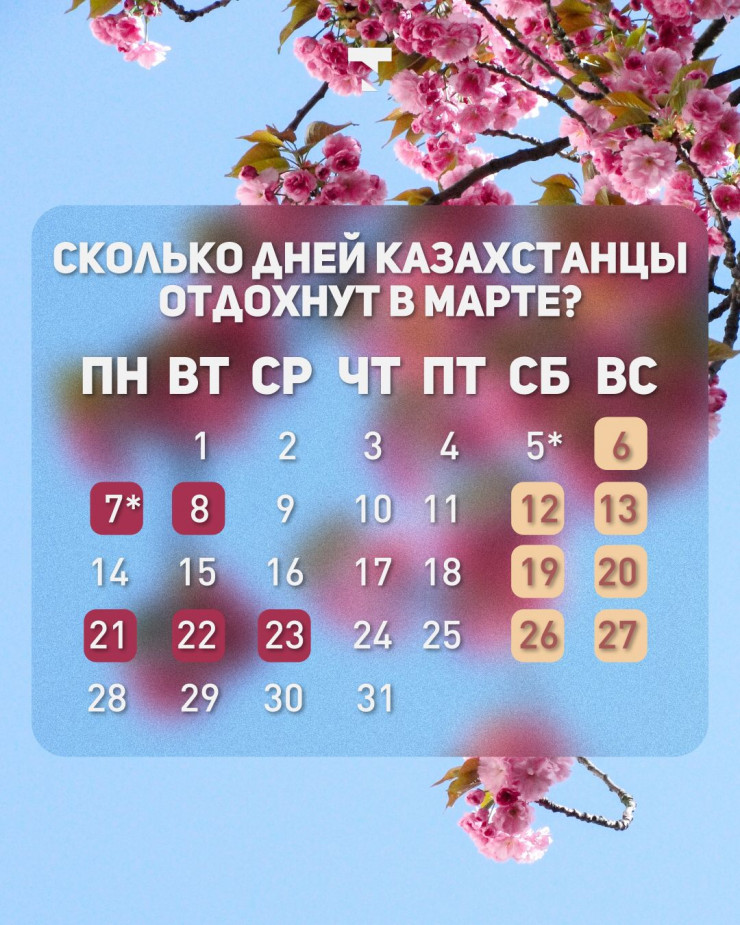 В марте 2022 года казахстанцы, работающие по пятидневной рабочей неделе, отдохнут в общей сложности 12 дней, передает Tengrinews.kz.