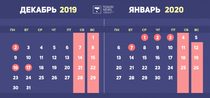 2020 год по традиции начнется с выходных дней на Новый год, празднование которого продлится четыре дня: с 1 по 4 января 2020 года, а вот воскресенье 5 января будет рабочим, 6 тоже, но уже 7 января казахстанцы вновь отдохнут.