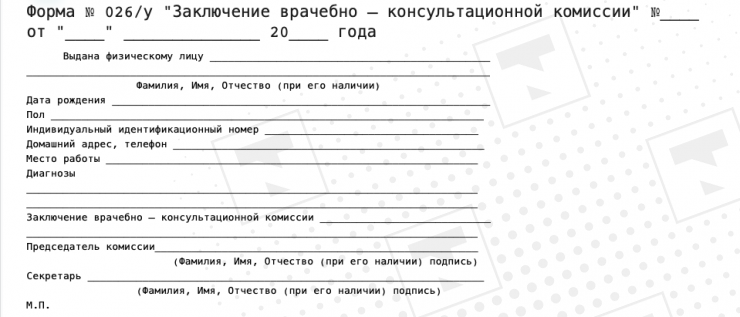 Заключение врачебно-консультационной комиссии выдается по форме № 026/у, утвержденной приказом исполняющего обязанности министра здравоохранения от 30 октября 2020 года № ҚР ДСМ-175/2020 "Об утверждении форм учетной документации в области здравоохранения".