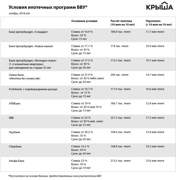 Исследование рынка, проведенное аналитиками Krisha.kz, показало, что сейчас на ипотечном рынке РК представлено порядка 10 банков, в каждом из которых есть несколько собственных жилищных продуктов. Учитывая, что некоторые проекты приостановлены либо имеют несопоставимые условия, за основу взята информация о восьми БВУ и их десяти предложениях.