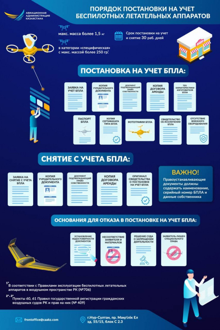 "Для постановки на учет лица, приобретающие БПЛА с целью эксплуатации, предоставляют заявку на учет с приложением документов согласно правилам государственной регистрации гражданских воздушных судов и прав на них. В случае постановки на учет БПЛА Авиационной администрациией Казахстана выдается свидетельство о постановке на учет сроком на пять лет или на срок действия договора аренды.