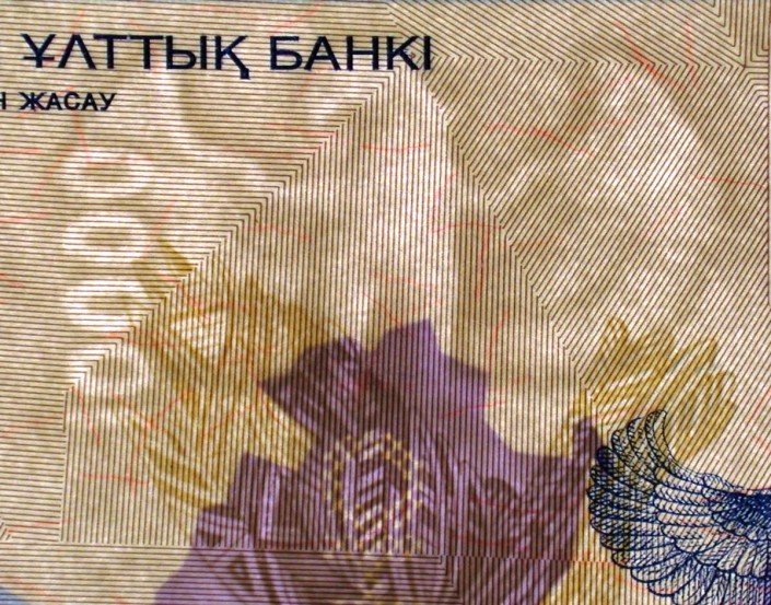 - водяной знак в виде мифической птицы Самрук и цифры 10 000, которые хорошо видны на просвет;