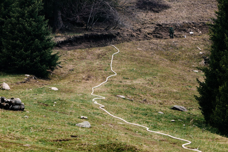 Внизу стоит одна пожарная машина. От машины на склон был протянут длинный шланг.