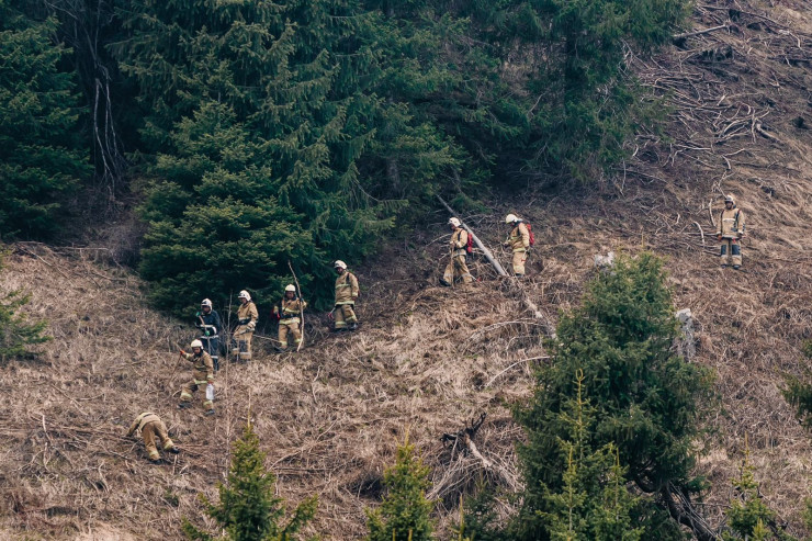 На участке у склона "Горельника", по словам корреспондента, работают 60 пожарных с водным рюкзаком по 20 литров. Они поднимаются на склон.