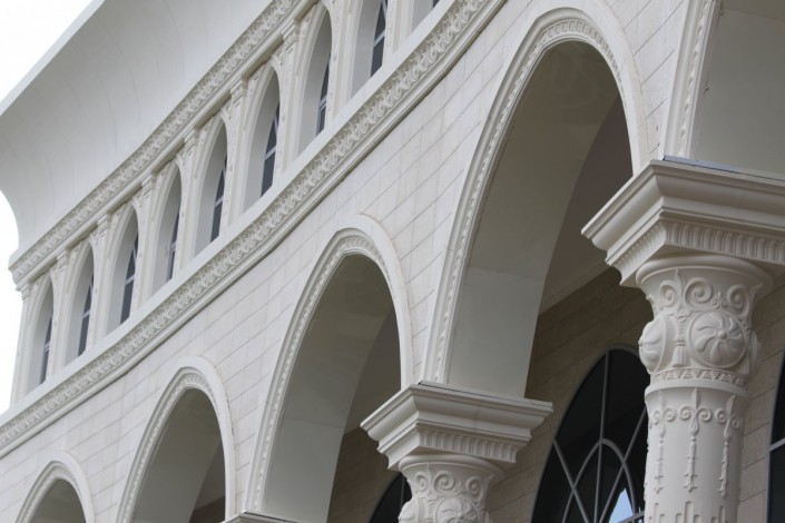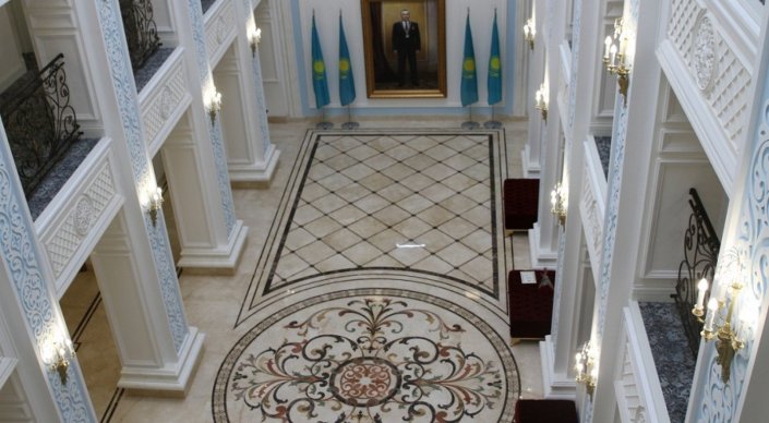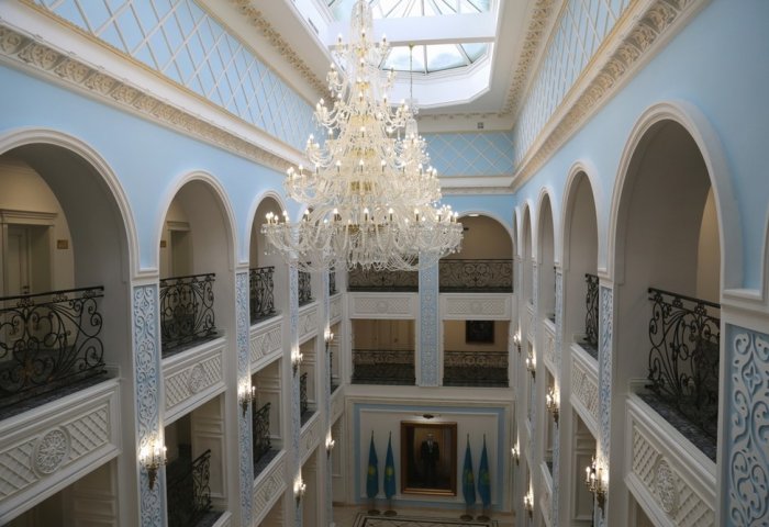 Потолок трехэтажного здания стилизован под крышу юрты. Стены выкрашены в бело-голубые тона.