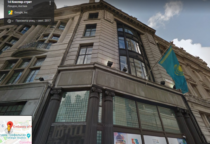 А вот посольство Казахстана в Великобритании. Также оно является дипломатическим представительством Казахстана в Ирландии и Исландии по совместительству. Послом в Великобритании является Ерлан Идрисов, он бывший министр иностранных дел РК.