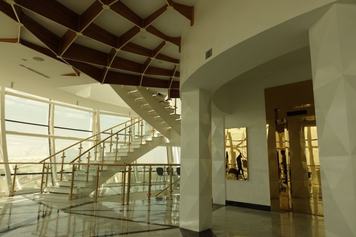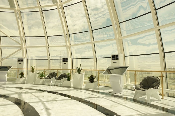 Кроме того, в стволе лифтовой шахты теперь установлены двойные стеклопакеты с энергосбережением, чтобы уменьшить затраты и потери тепла. Здесь, по задумке архитекторов, использовался специальный структурный силиконовый герметик, который работает в широком диапазоне температур, чтобы стекло в дальнейшем не трескалось.