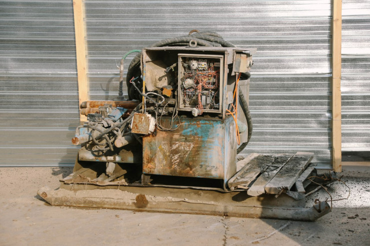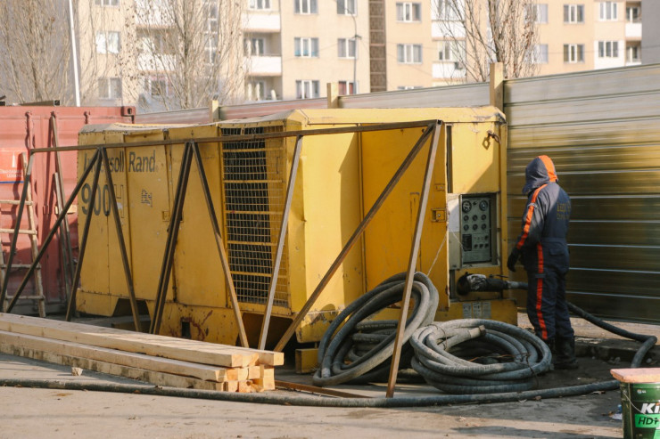 Рядом стоит контейнер, в котором живут строители, установлен генератор. На территории то тут, то там можно увидеть деревянные брусья и пластиковые трубы.