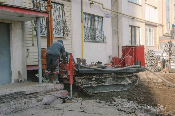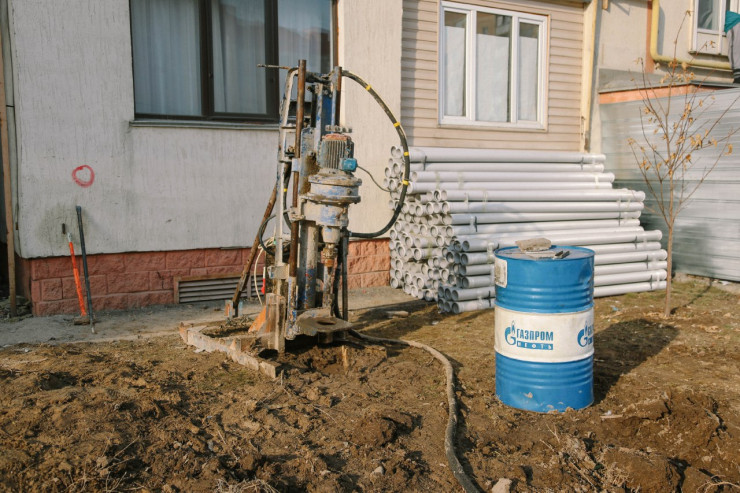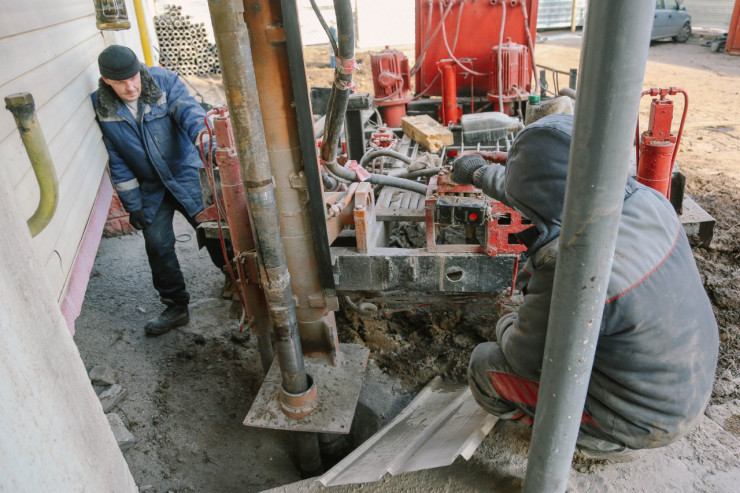 За забором полным ходом идут работы. Специалисты с помощью оборудования бурят скважины для свайных конструкций.