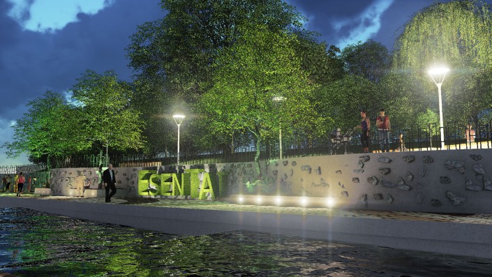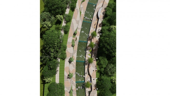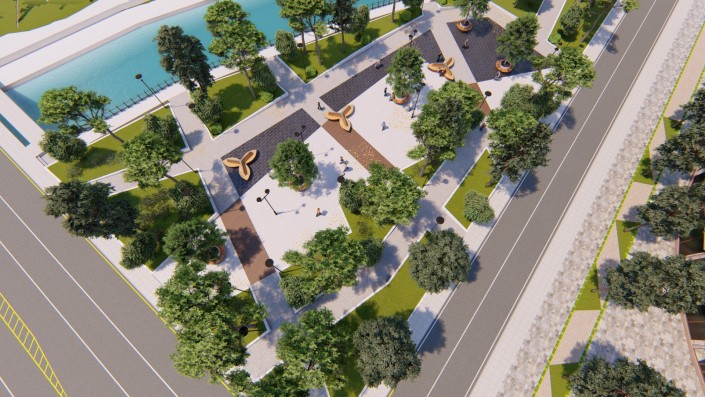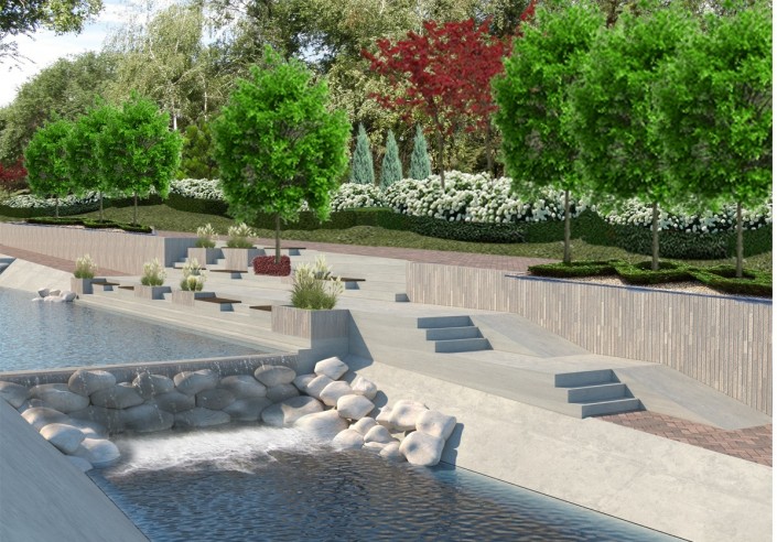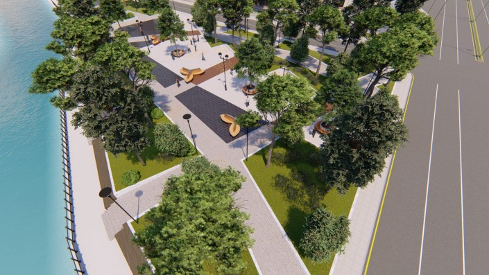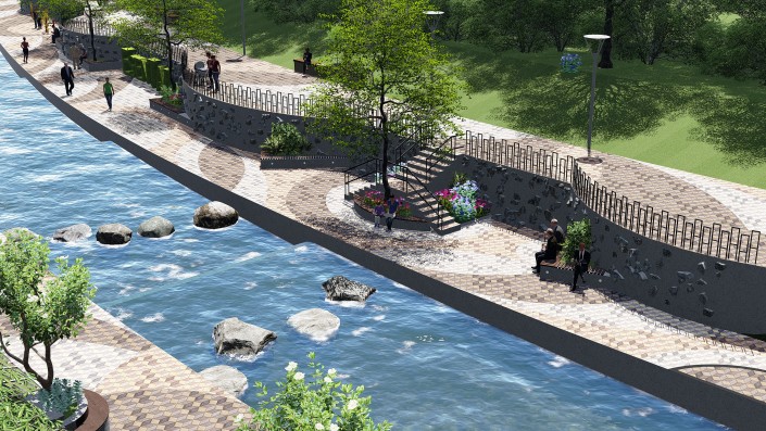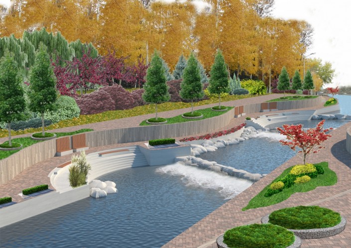 Планируются расширение существующих и устройство новых пешеходных дорожек и аллей на обоих берегах, устройство площадок для отдыха с установкой детских игровых и спортивных комплексов, в том числе инклюзивных. Предусмотрены спуски к воде, на отдельных участках русла реки предлагается заменить бетонные "запруды" на специально подобранные валуны. Запроектирован сухой фонтан. На пешеходных аллеях установят светильники торшерного типа, также встроенная подсветка появится у зеленых насаждений и водной глади.