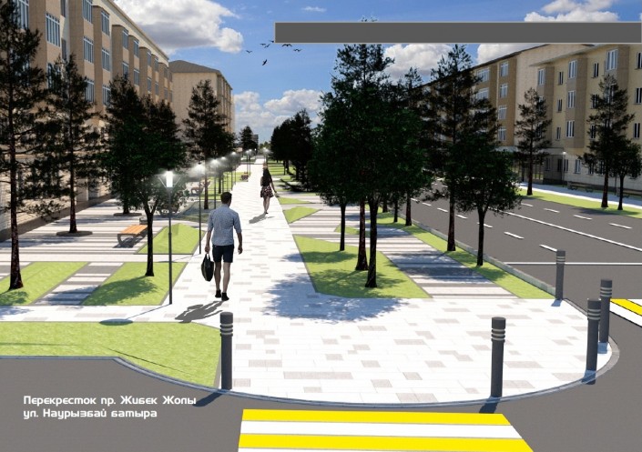 Проект преобразования жилищно-гражданских объектов улицы Жибек жолы (от улицы Желтоксан до проспекта Сейфуллина). Участок - 550 метров. Площадь проектируемой территории - 3,1 гектара. Площадь благоустройства - 1,85 гектара. Площадь озеленения - 0,84 гектара. Планируется высадить 207 деревьев.