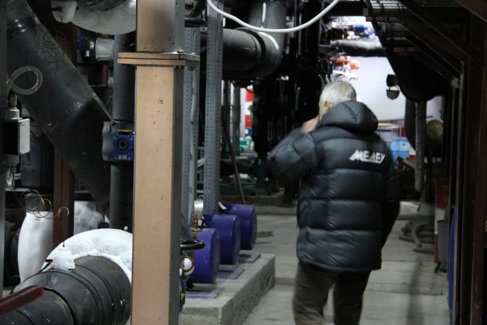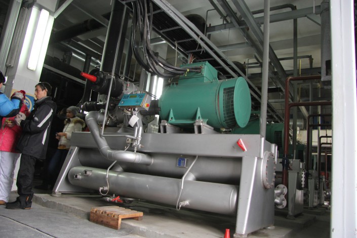 В машинном зале находится станция, которая охлаждает лед для высокогорного катка. За ночь морозильное оборудование, которое располагается в двух больших павильонах, успевает полностью выработать лед на следующий день. Стоит подчеркнуть, что в данное помещение пропуск имеют только инженеры.
