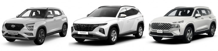 В разделе "кроссоверы" Hyundai предлагает купить модели Creta, Tucson и Sante Fe.