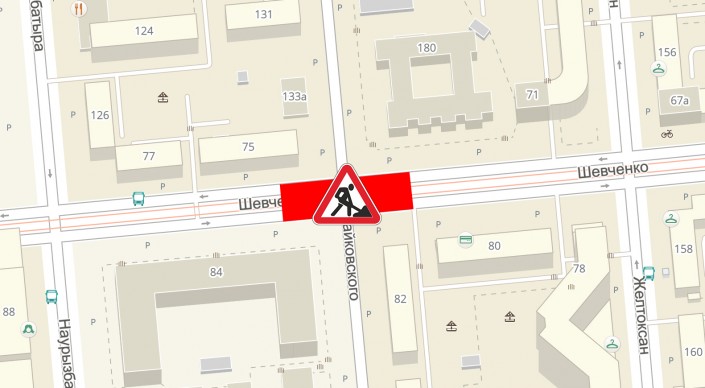- 1 и 2 июля - пересечение улиц Шевченко и Чайковского. Общественный транспорт будет ездить по улицам Кунаева - Фурманова - Курмангазы и далее движение будет осуществляться по маршруту.