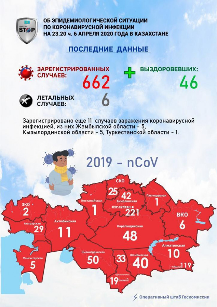 На данный час в стране подтвержден 662 случая регистрации коронавируса, из них в Нур-Султане - 221 случай, Алматы - 119 случаев, Карагандинской области - 48 случаев, Акмолинской области – 42 случая, Атырауской области - 29 случаев, Жамбылской области – 40 случаев.