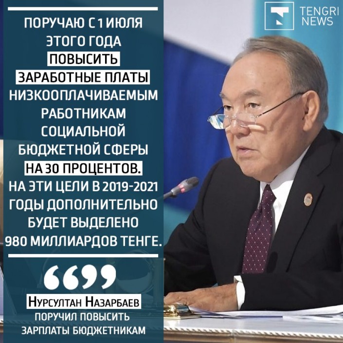 "Сегодня важно усилить меры по повышению уровня благосостояния казахстанских семей. Они напрямую затронут более 1 миллиона гражданских служащих, занятых в сфере здравоохранения, образования, социальной защиты, культуры, спорта, сельского хозяйства и других. Поручаю с 1 июля 2019 года: повысить заработную плату низкооплачиваемым работникам бюджетной сферы до 30 процентов. Поднять в среднем на 25 процентов низовым работникам исполнительных органов, которые непосредственно работают с гражданами на районном и областном уровнях", - дал поручение Президент Казахстана.