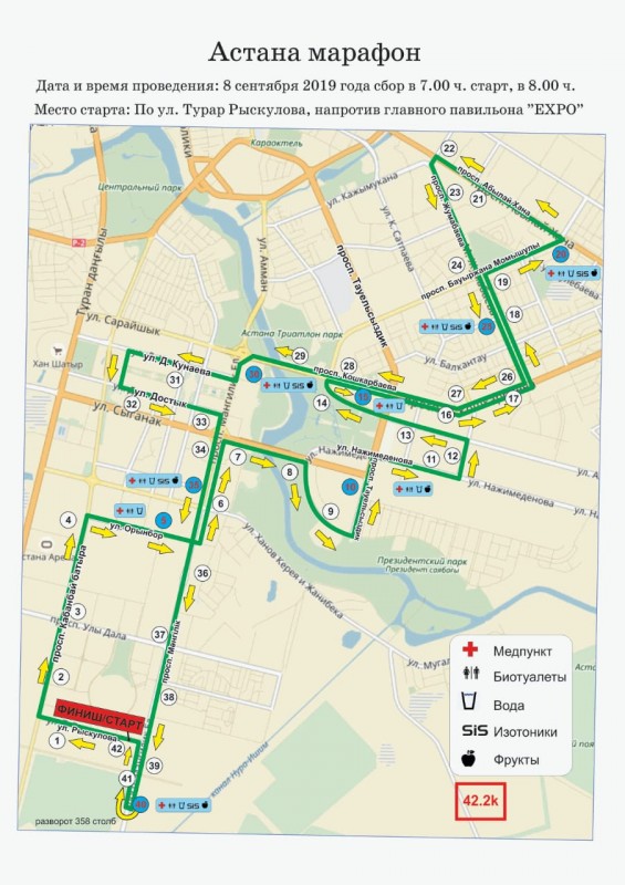 Маршрут дистанции на 10 километров будет пролегать через улицу Рыскулова - проспект Кабанбай батыра - улицу Орынбор - проспект Мангилик ел - улицу Рыскулова.