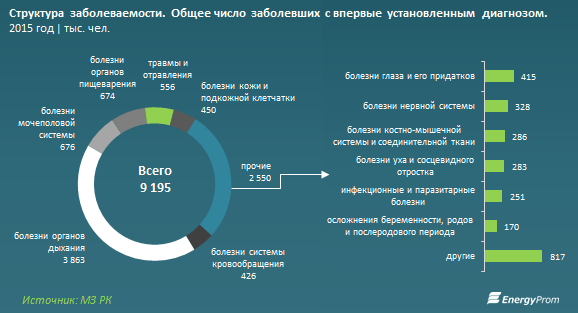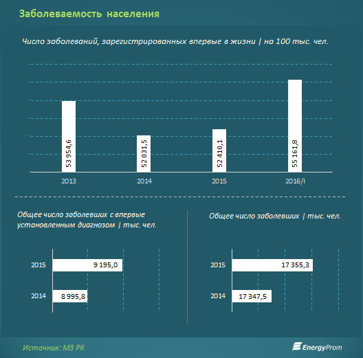 В целом по итогам 2015 года общее число заболевших казахстанцев достигало 17,36 миллиона человек, число заболевших с впервые установленным диагнозом - 9,2 миллиона (на 2,2 процента больше, чем годом ранее).