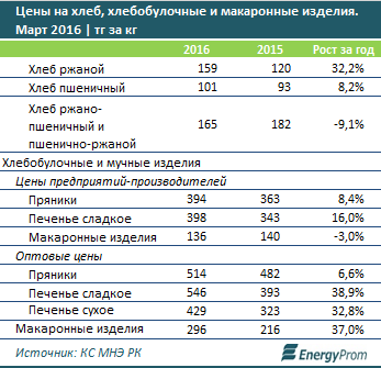 По информации аналитиков, предприятия-производители продавали в марте 2016 года ржаной хлеб по 159 тенге за килограмм (на треть дороже, чем в марте 2015 года), пшеничный - по 101 тенге за килограмм (плюс 8,2 процента за год), ржано-пшеничный - по 165 тенге за килограмм (на 9,1 процента дешевле, чем годом ранее).