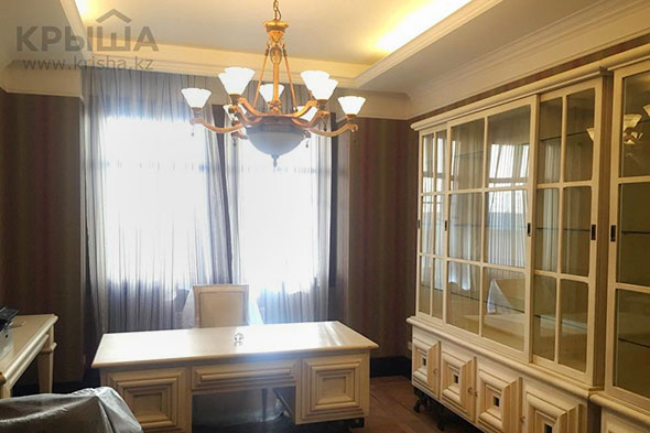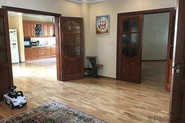 Недвижимость расположена на втором этаже четырехэтажного дома на улице Горной в Медеуском районе Алматы. В квартире имеются гостиная, столовая, кухня со встроенной мебелью, две спальни, кабинет, два санузла и два остекленных балкона.