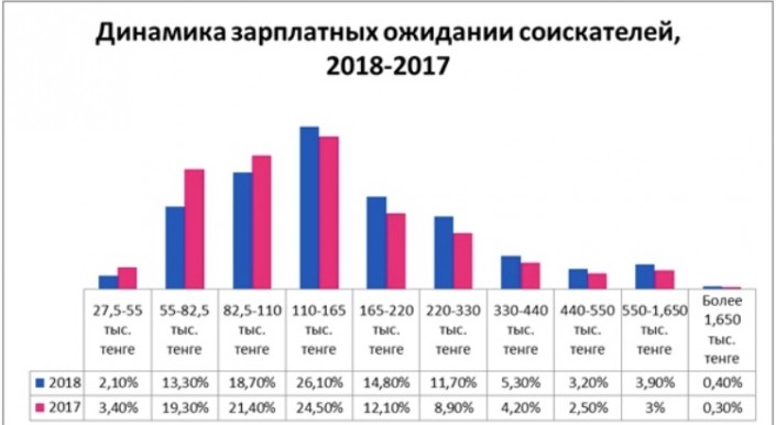 Выше свой труд оценивают 3,2 процента соискателей - они согласны взяться за проекты, если им будут платить от 330 до 440 тысяч тенге в месяц, 3,9 процента - от 550 до 1 миллиона 650 тысяч тенге. 0,4 процента требуют заработную плату выше 1 миллиона 650 тысяч тенге. В то же время 13,3 процента готовы работать за 55 и 82,5 тысячи, а 2,1 процента готовы довольствоваться 27,5 и 55 тысячами тенге.